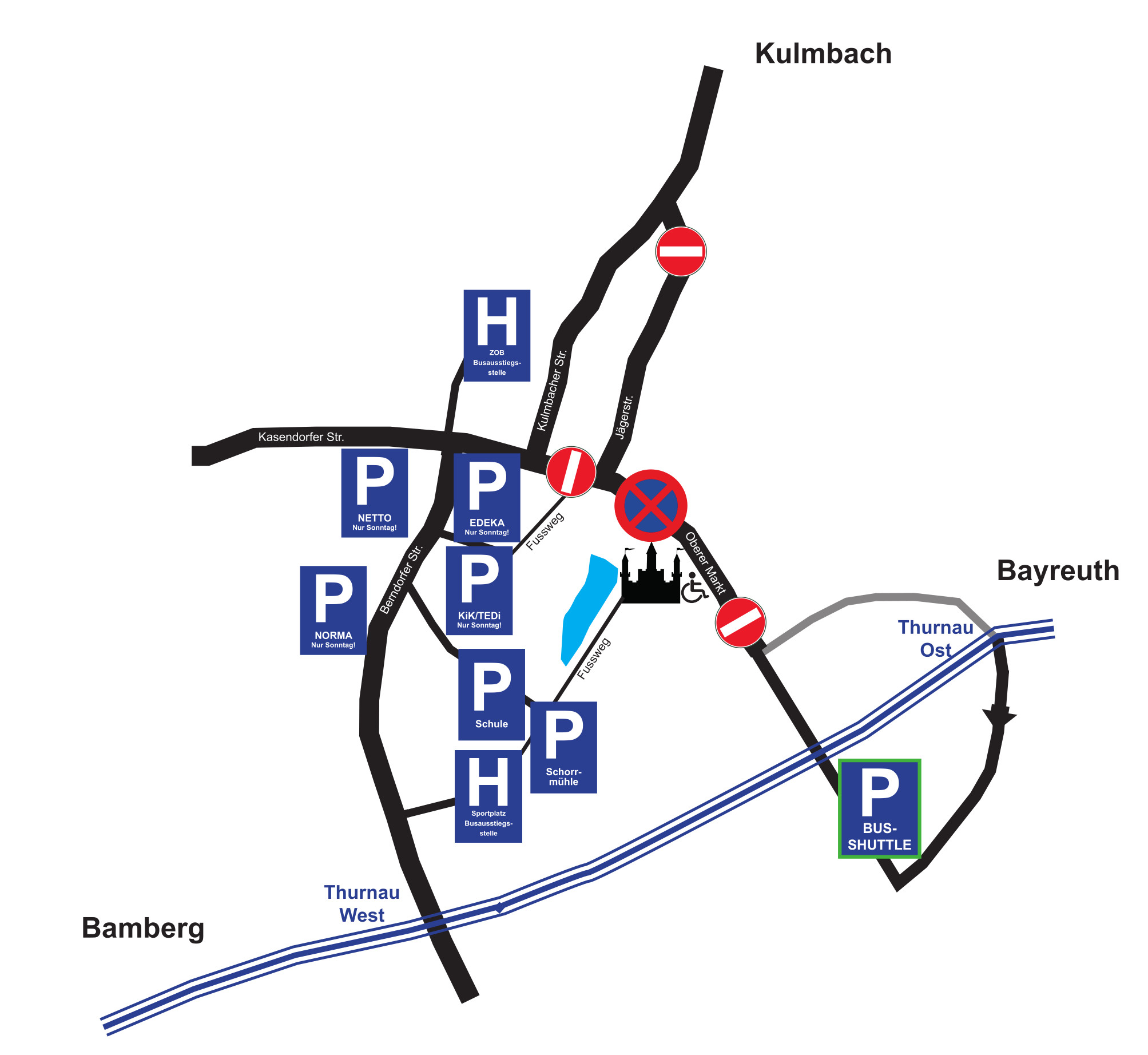 Hinweis für Reisebusse: Bitte nutzen Sie zum Aussteigen den Busbahnhof ZOB (erreichbar über die Autobahnausfahrt Thurnau West), von welchem der Töpfermarkt in 7 Minuten fußläufig erreichbar ist.